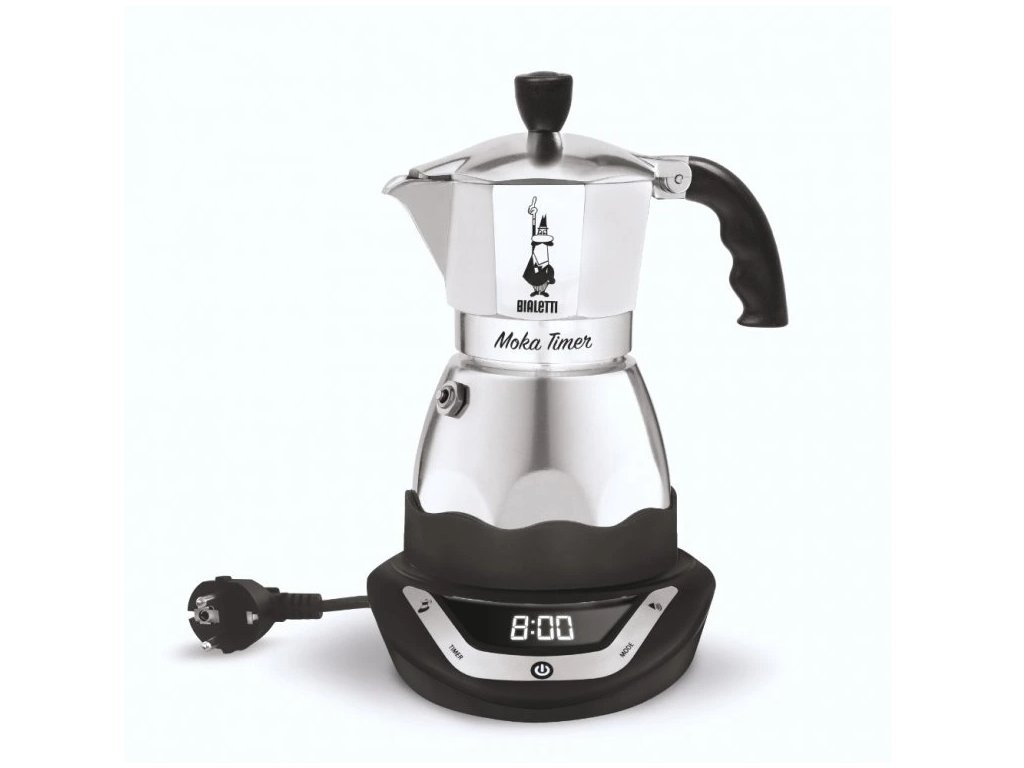 Aluminum moka pot Moka Timer from the Italian company Bialetti equipped with an electronic heating unit with a timer. It allows the convenient preparation of coffee wherever there is a regular electrical outlet. It can also keep coffee warm for up to twenty minutes.