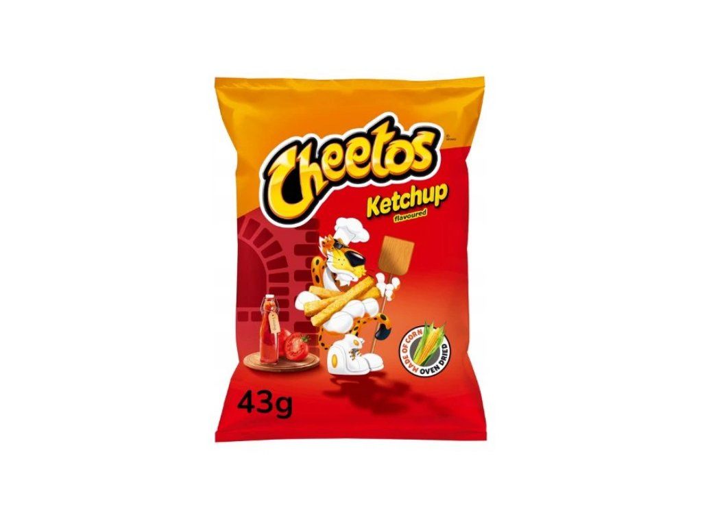 A tasty corn snack with a strong ketchup flavor - crunchy Cheetos chips flavored with sweet and sour ketchup. Each bag contains 43 g of snack, ideal as a quick snack or an addition to a movie or party.