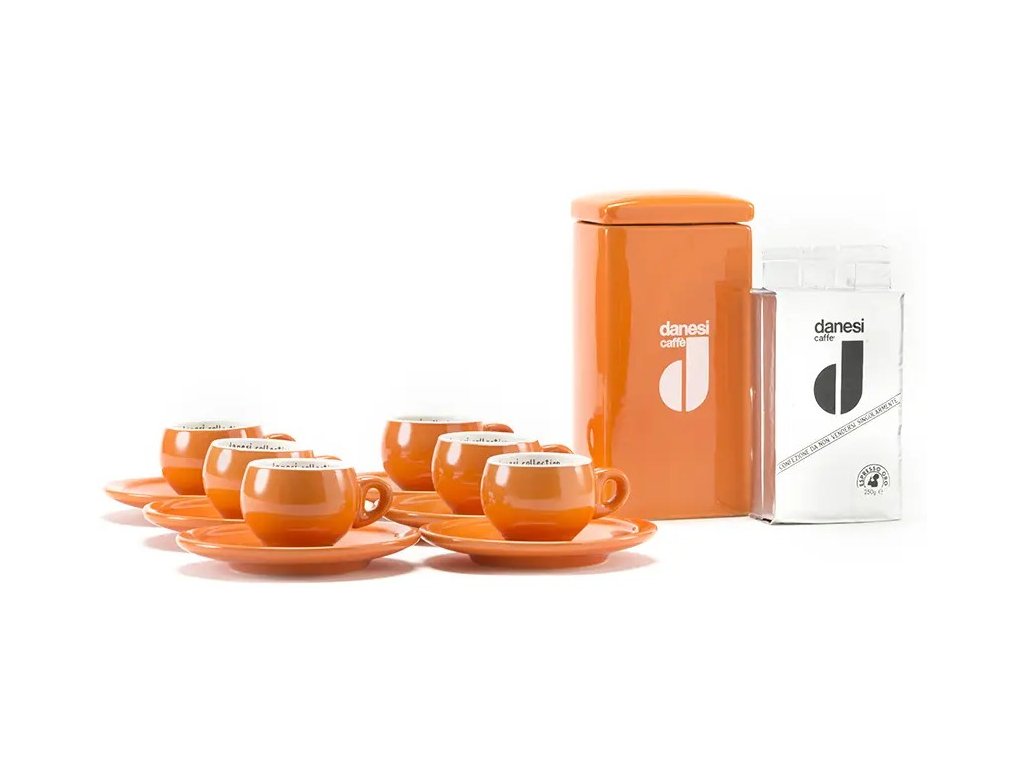 Danesi La Forma Gift Pack - Dark's Cassette Kava 250g + 6 espresso cups and 6 saucers - orange