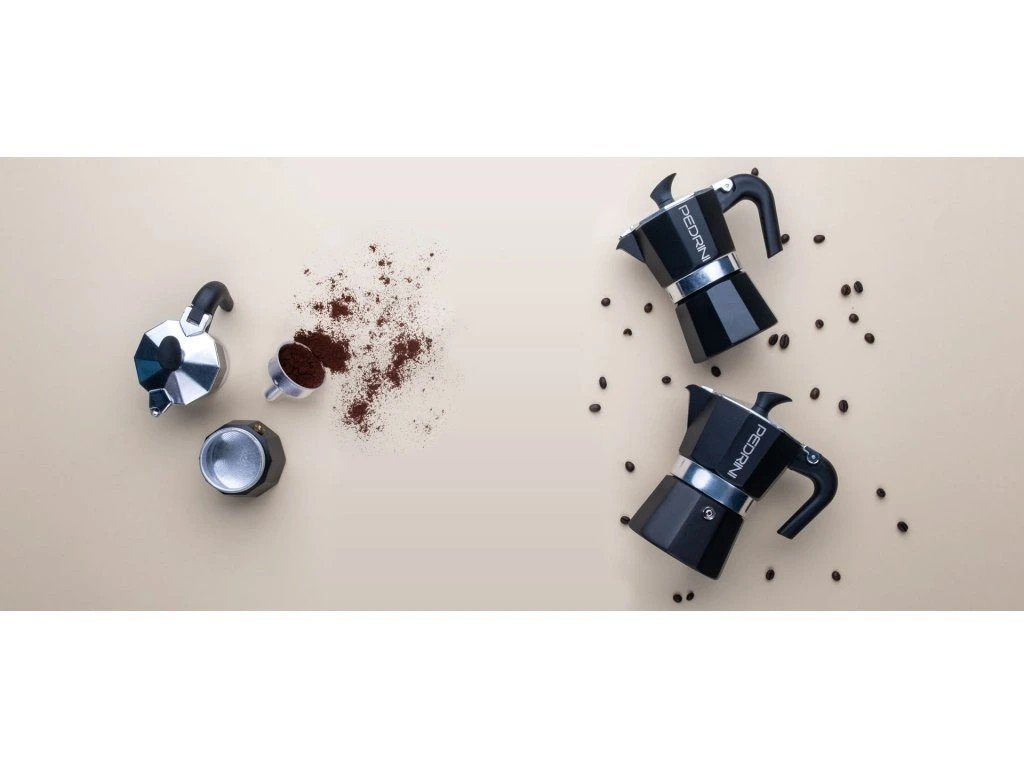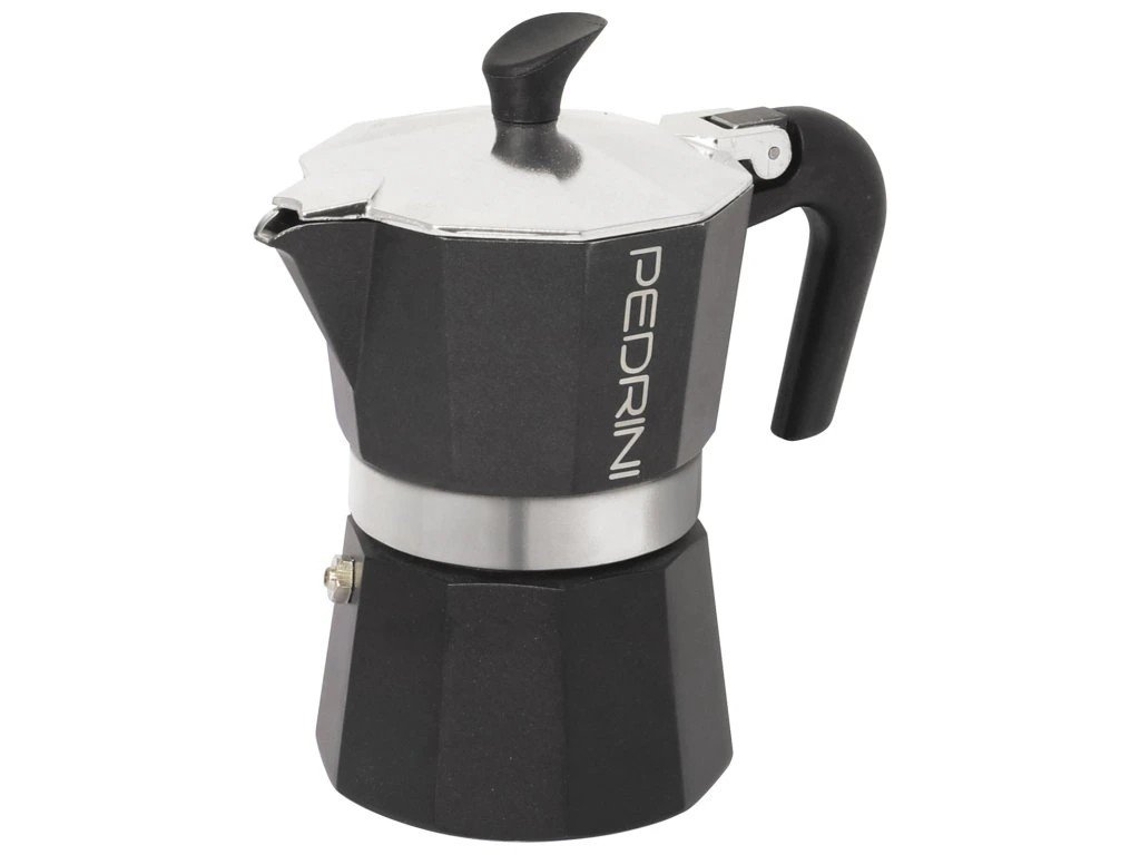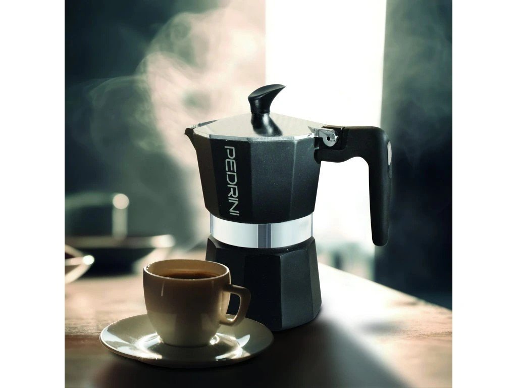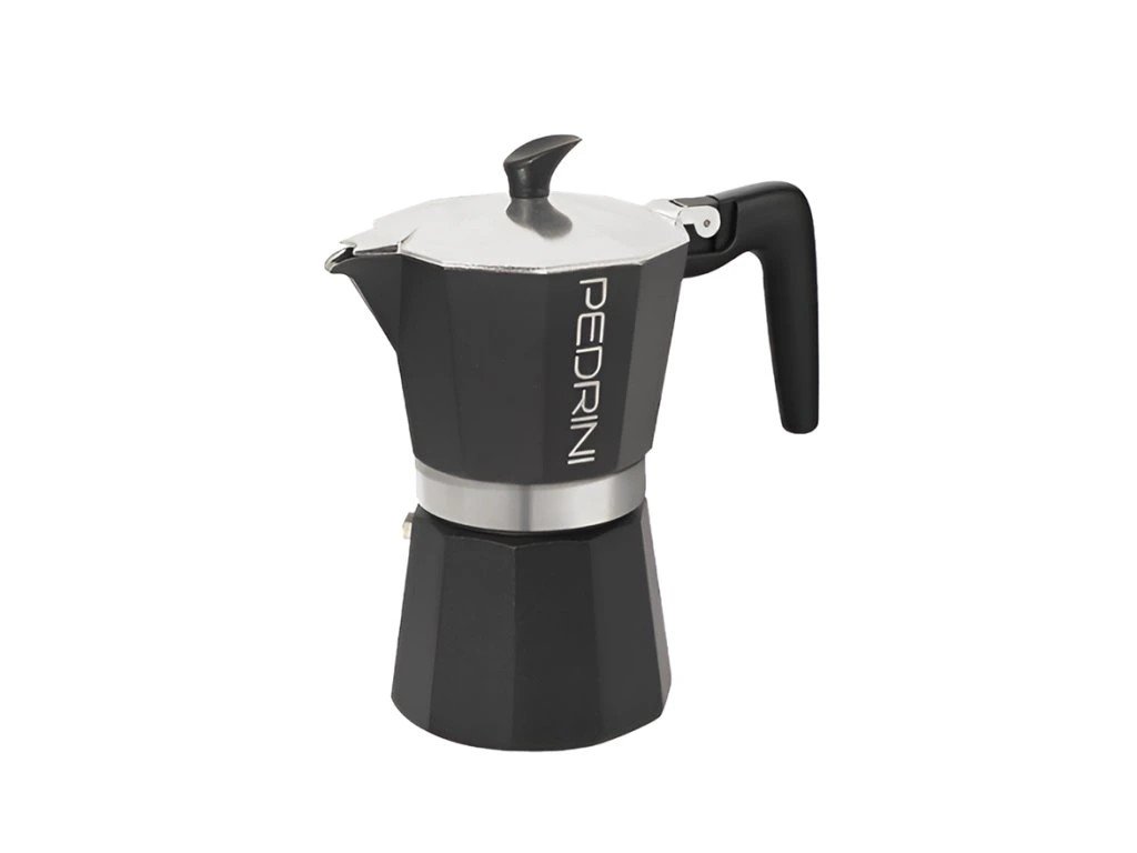 Pedrini Aroma is a moka pot with a characteristic all-black design, designed by the Italian brand Pedrini for lovers of distinctive style. It is made of EN601 food-grade aluminum , which with regular use creates a delicate patina, enriching the taste of the prepared coffee. The ergonomic heat-resistant handle and lid handle are made of durable plastic with heat resistance up to 210 °C . A high-quality safety valve ensures safe coffee preparation without the risk of overpressure. The pot is designed for electric, glass-ceramic and gas hobs , not for induction.