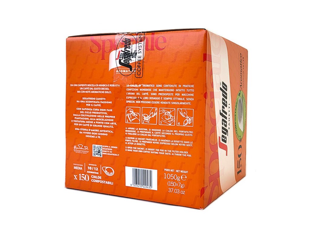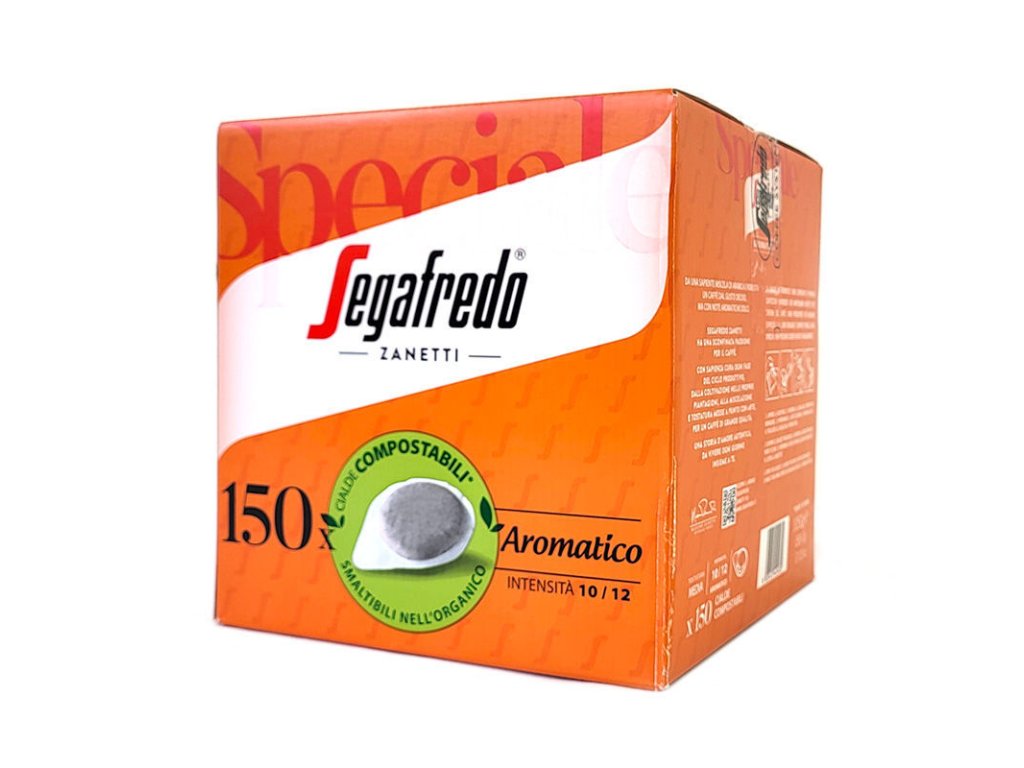 Segafredo Zanetti Aromatico pods contain 7 grams of ground coffee and are ideal for preparing an excellent espressowith coffee machines that use the pod ESE (Easy Serving Espresso) system.The Aromatico blend comes from a blend of Arabica and Robusta coffee. The result is an espresso with a strong taste, but with sweet aromatic notes.Each pack contains 150 ESE soft pods 44 mm individually packed in practical single servings that keep the coffee aroma intact.The dosage is always optimal and the pod can be thrown into the organic waste after use, as it is compostable.Net weight 1050 grams (150 x 7g)For use on espresso machinesIntensity 10/12Medium roastStrong flavor but with sweet aromatic notes